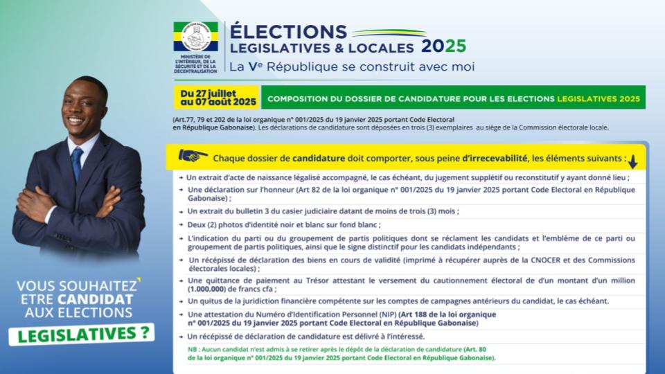 Chaque dossier doit être complet et conforme aux exigences de la loi organique n° 001/2025 du 19 janvier 2025 portant Code électoral en République Gabonaise (articles 77, 79 et 202). La liste des pièces que doit comporter chaque dossier sous peine d’irrecevabilité a été précisée par le Ministère de l’Intérieur.