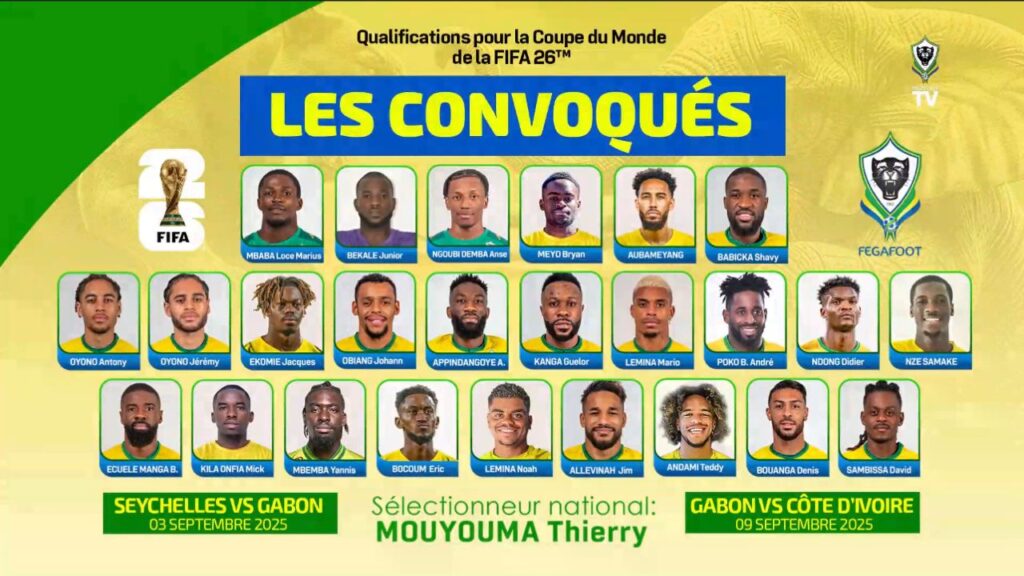 Libreville, le 29 août 2025-(Dépêches 241). Ce 29 août 2025, à l’hôtel Nomad d’Akanda, le sélectionneur national Thierry Mouyouma a rendu publique la liste des 25 joueurs retenus pour les deux prochaines rencontres des Panthères du Gabon, comptant pour les éliminatoires de la Coupe du monde 2026. Le Gabon affrontera les Seychelles le 3 septembre, puis la Côte d’Ivoire le 9 septembre à Franceville. Deux matchs décisifs pour la qualification au Mondial.