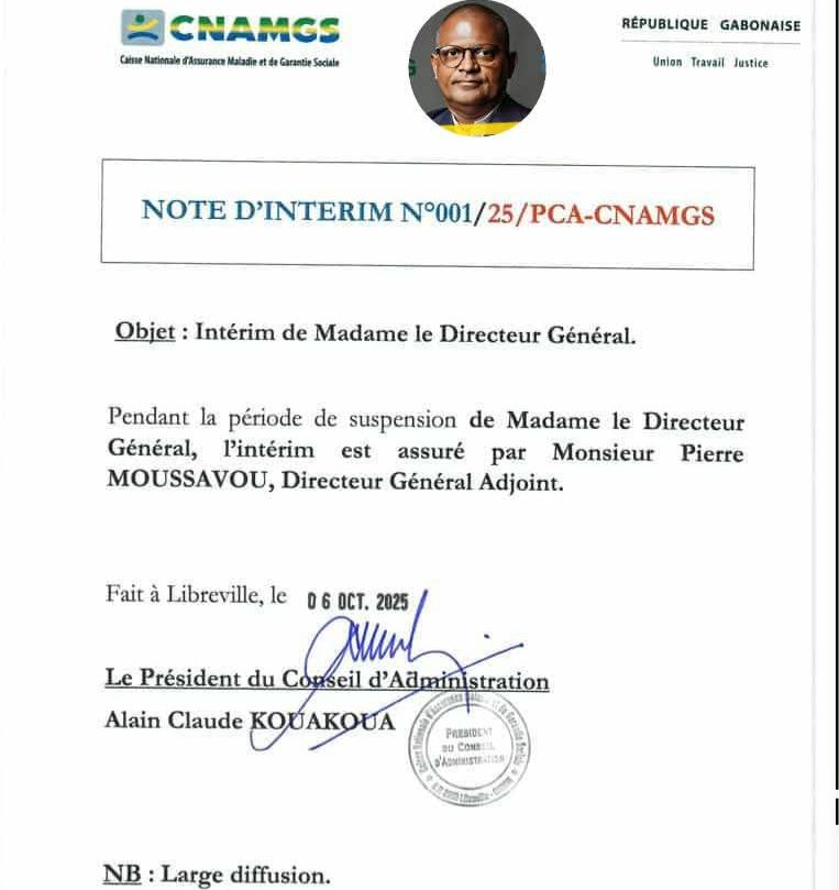 Libreville, le 6 octobre 2025 – (Dépêches 241). La tension au sommet de la CNAMGS franchit un nouveau palier. Alors même que Nadia Christelle Koye conteste officiellement sa suspension, qu’elle juge « abusive » et « contraire à la loi », le Président du Conseil d’Administration, Alain Claude Kouakoua, a pris acte de son départ en signant une note d’intérim n°001/25/PCA-CNAMGS. Ce document désigne Pierre Moussavou, Directeur Général Adjoint, pour assurer l’intérim à la tête de la Caisse.