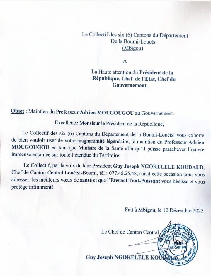 Libreville , le 11 Décembre 2025 – (Dépêches 241). Un courrier adressé au président de la République, Chef de l’Etat Brice Clotaire Oligui Nguema par le chef de canton central Louetsi-Boumi, Guy Joseph Ngok Koudald, et parlant au nom d’un supposé « collectif des six cantons », tente de plaider pour le maintien d’Adrien Moungoungou au gouvernement. Une démarche qui, au-delà du malaise qu’elle suscite, révèle une incompréhension flagrante de ce que doit être une République moderne et de ce que nous ne voulons plus voir dans la Ve République.