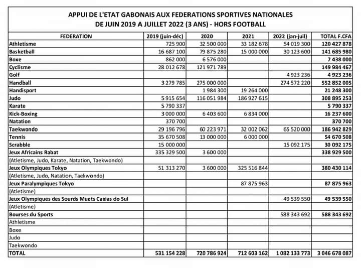 Égratigné sur la léthargie du sport au Gabon depuis plusieurs années du fait de l’absence de financement de l’Etat, le ministre Franck Nguema s’est empressé de répondre, document à l’appui. « Depuis mon arrivée en juin 2019 au Ministère en charge des Sports (…), le Gouvernement Gabonais a pu, de juin 2019 à juillet 2022 (3 ans) mobiliser et décaisser des ressources financières de plus de 3 milliards de FCFA (+4,5 millions d’euros) pour soutenir les activités des Fédérations sportives nationales, hors de celles du football », a-t-il indiqué.